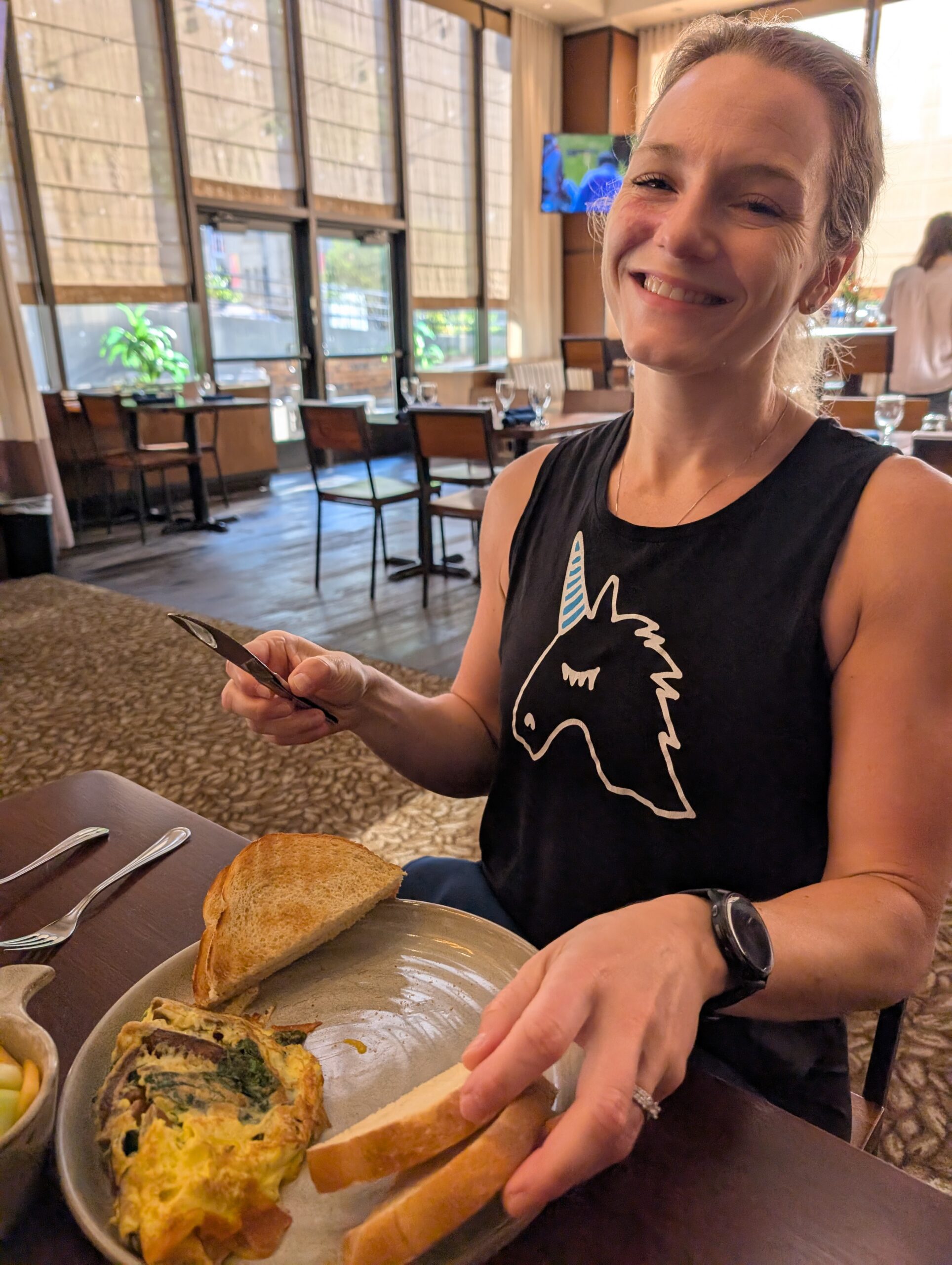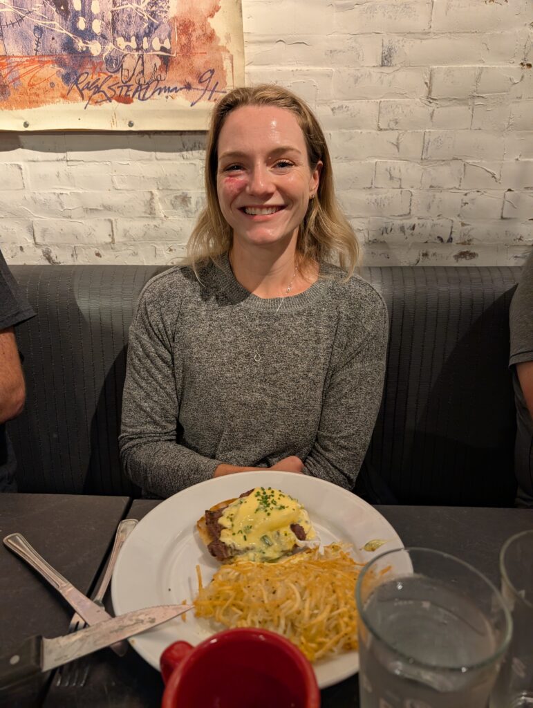 I ordered a breakfast smashburger, which was quite delicious, and Angela opted for the bison birria benedict. We also split an order of sausage bread. As on my last visit, the food was delicious, the atmosphere was great, and the company was even better.