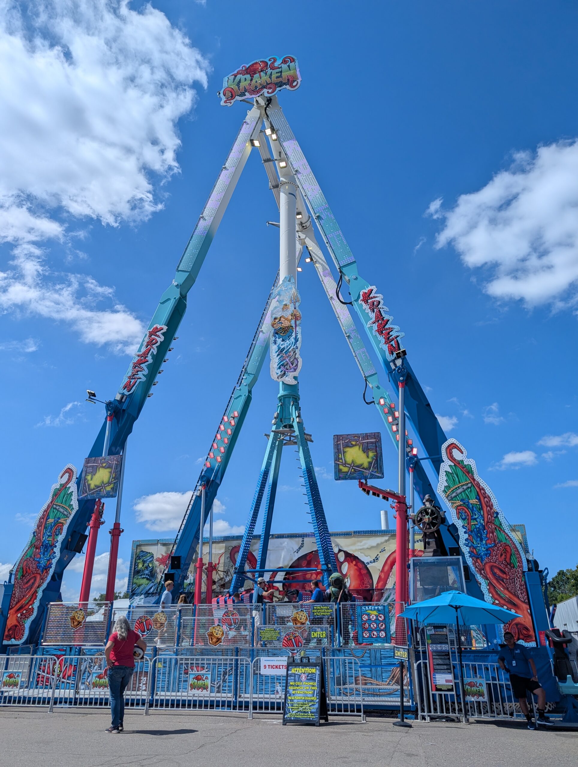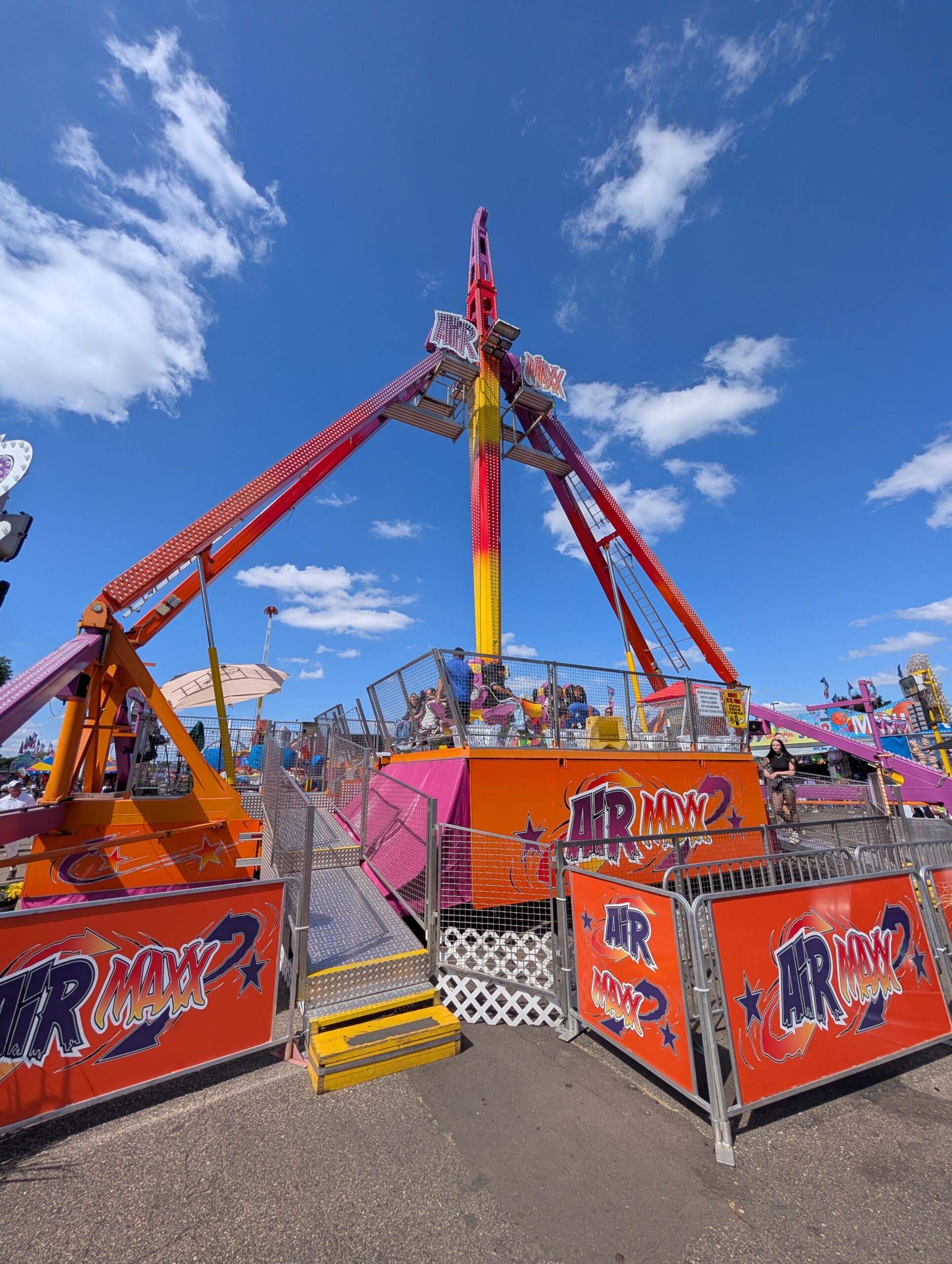 At this point, we decided to embrace our younger selves and ride some fair rides. We chose two carnival contraptions that spun us upside down and in circles. I think two is about all we can handle these days.