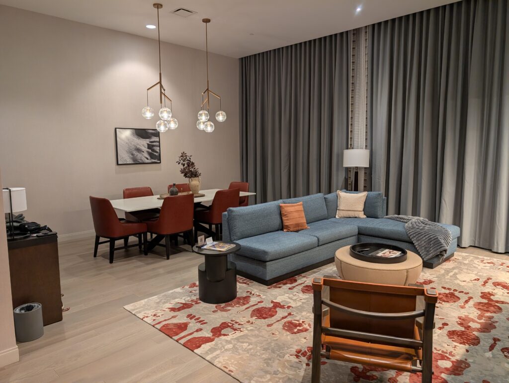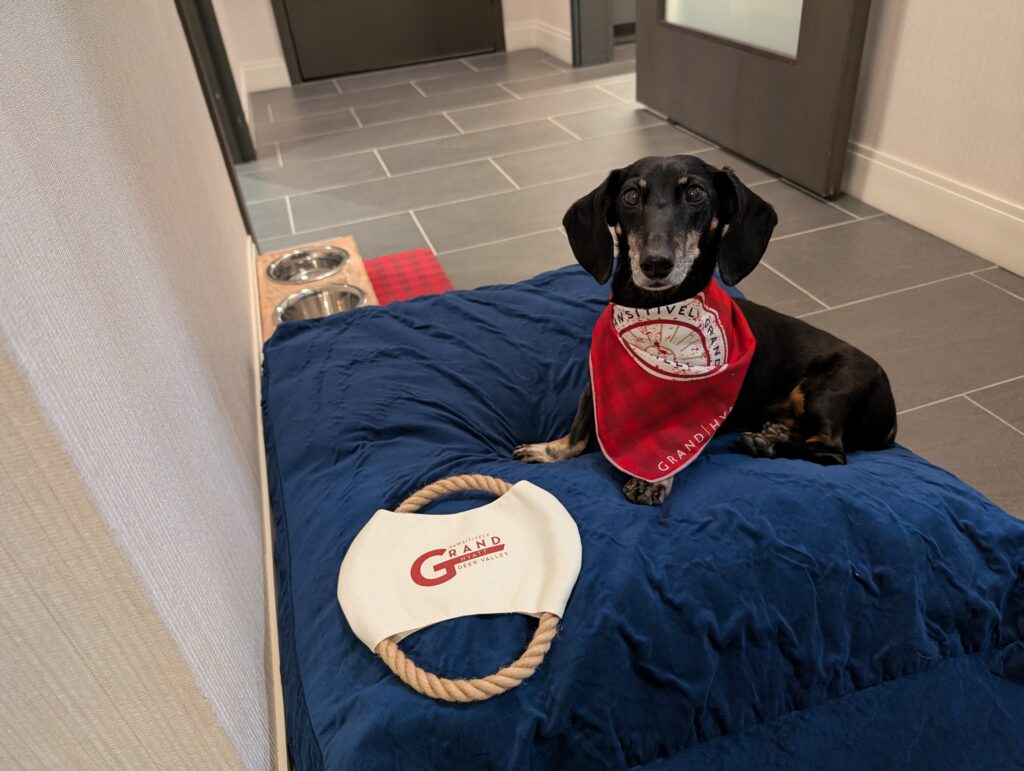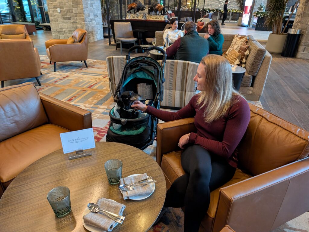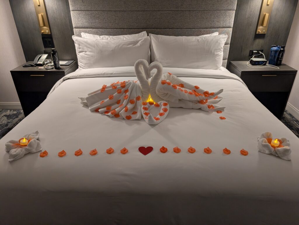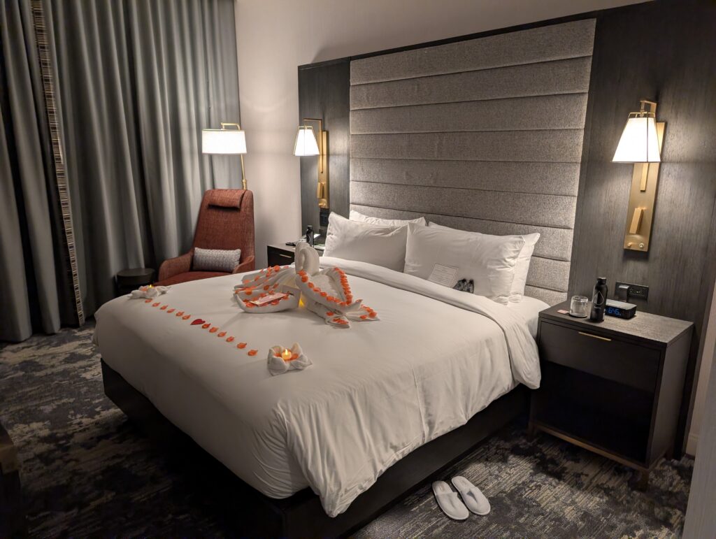 Our room was large and well-appointed with comfortable furnishings, tons of space, and a special welcome for Fitz, which I really appreciated. Guest services also put together a nice display on our bed wishing us a happy anniversary.