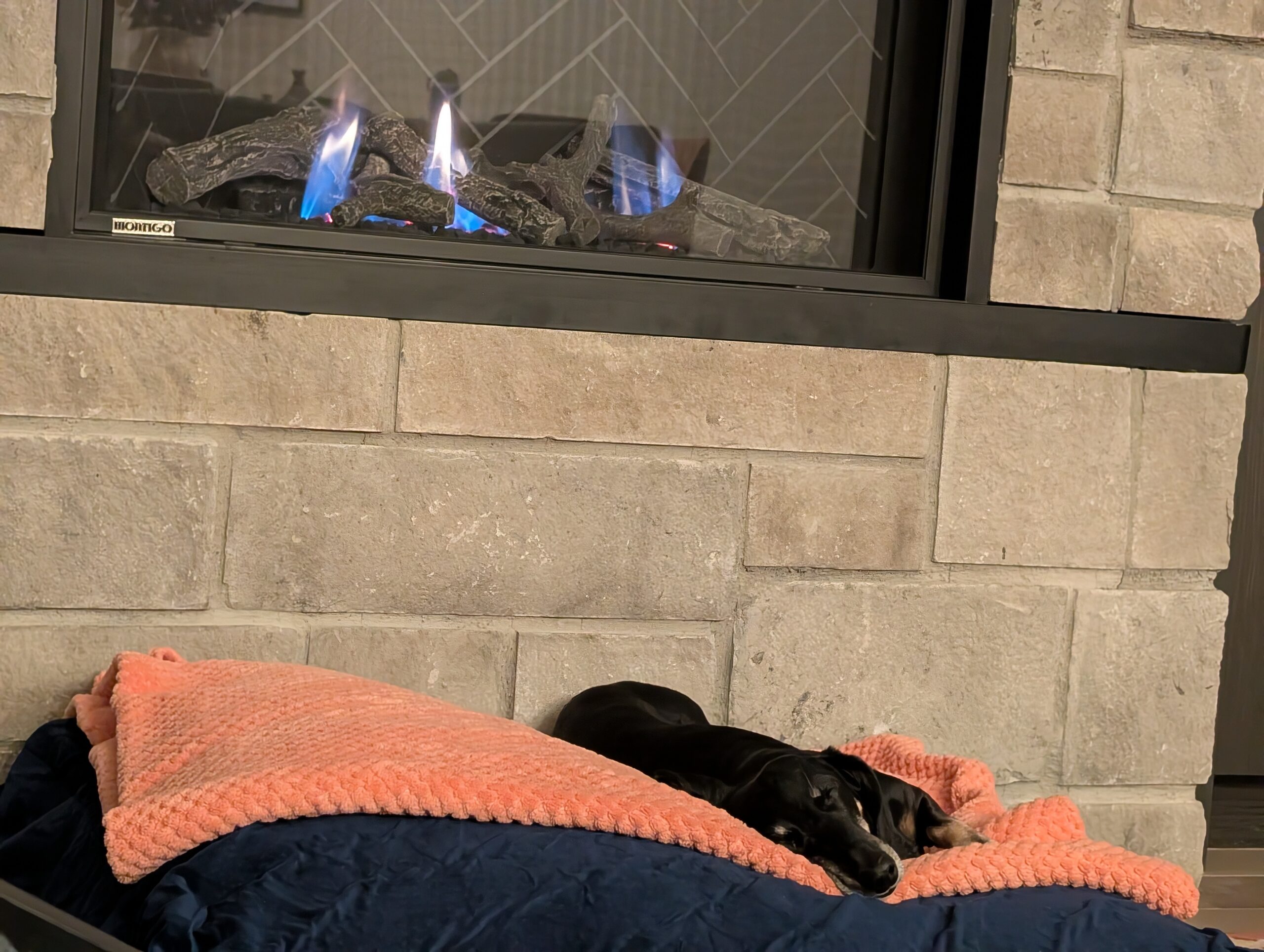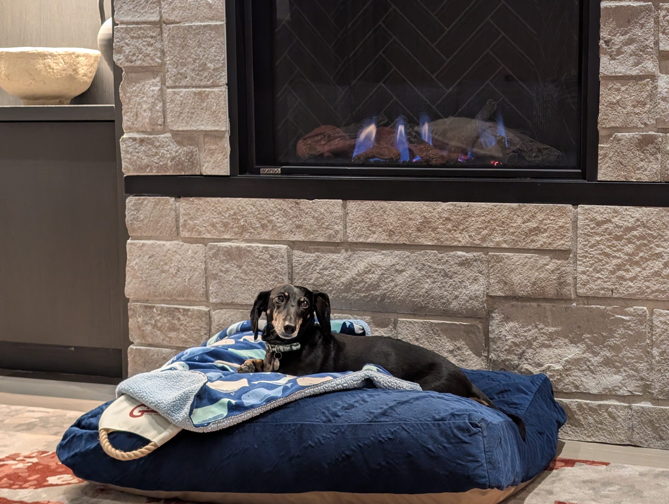 When we returned to the room, I turned the fireplace on and Fitz assumed the position we would find him in throughout our stay.