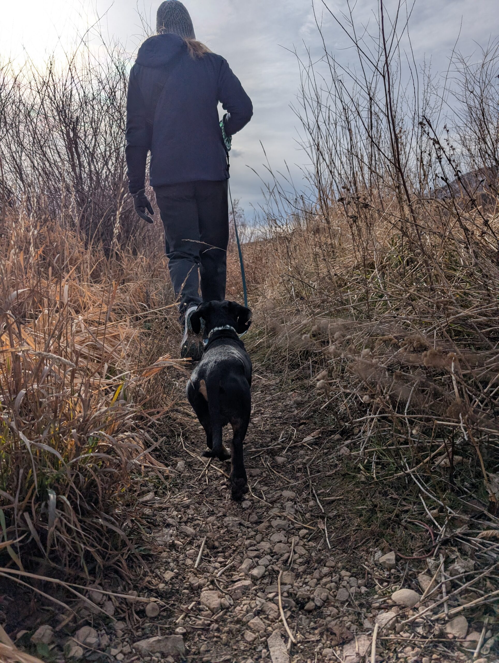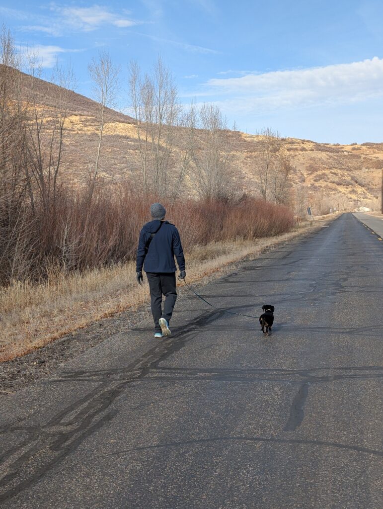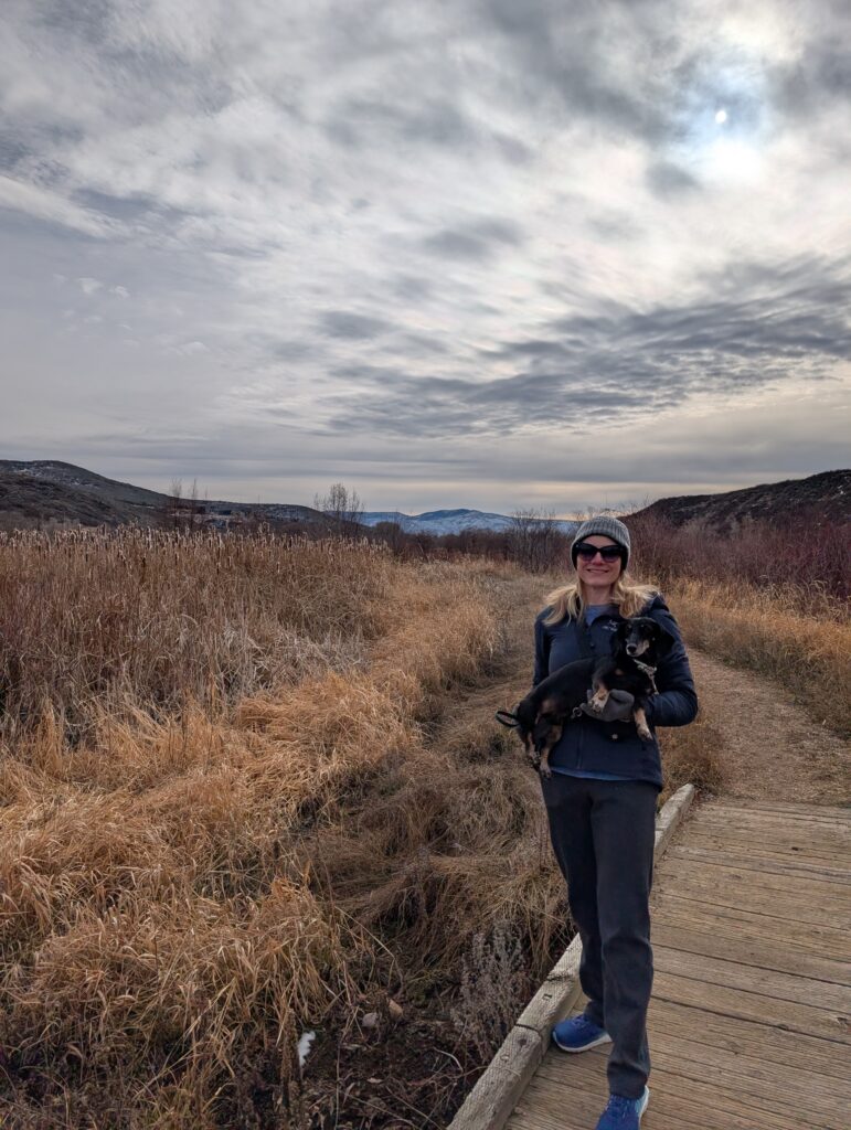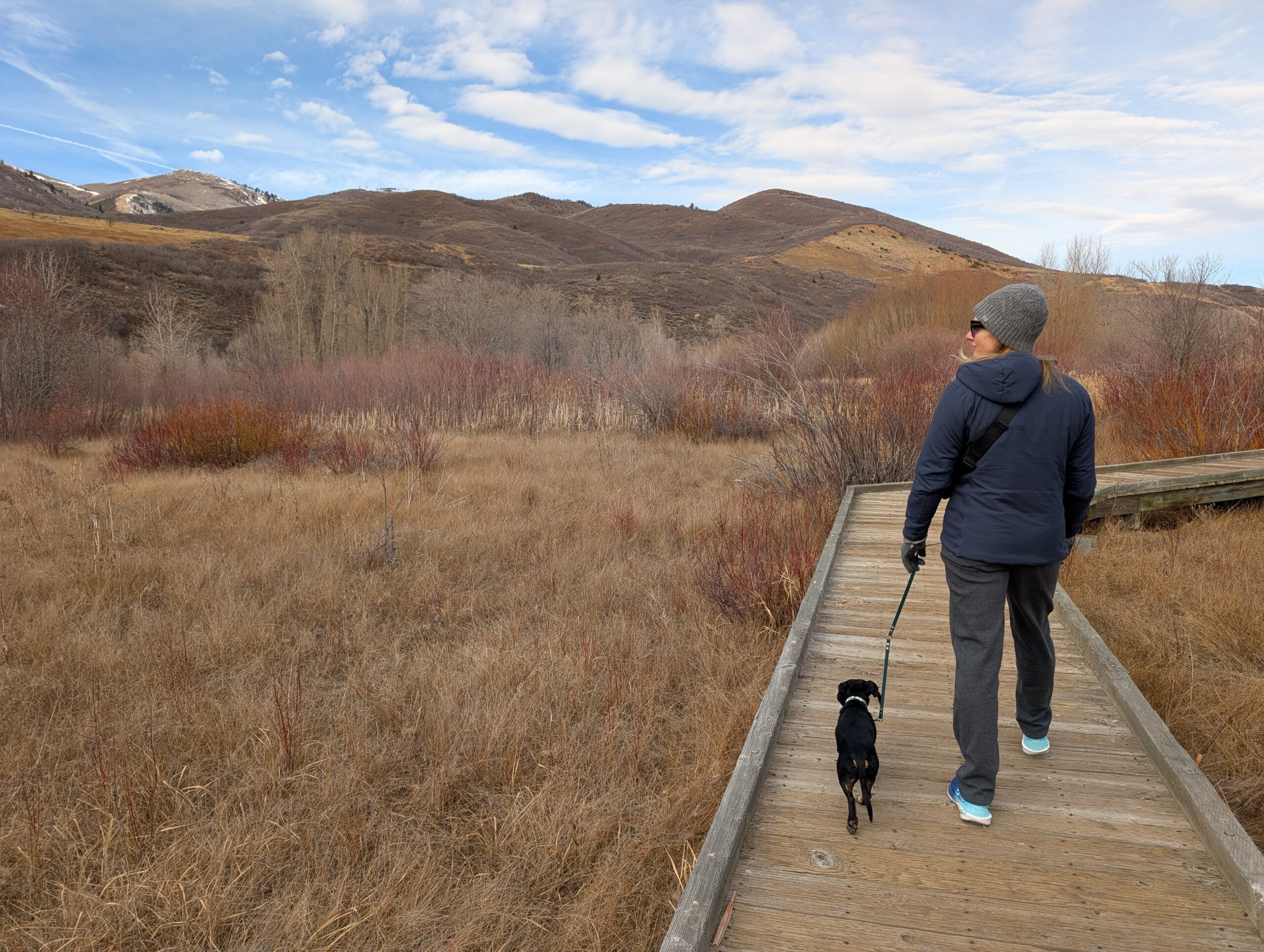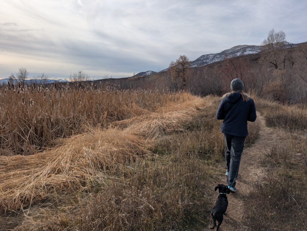 After breakfast, we loaded up the car and drove to the Provo River Walk. It was quite muddy and Fitz definitely engaged all-paw-drive during our two-plus-mile hike. While we started out cold, we definitely warmed up as we trudged along.