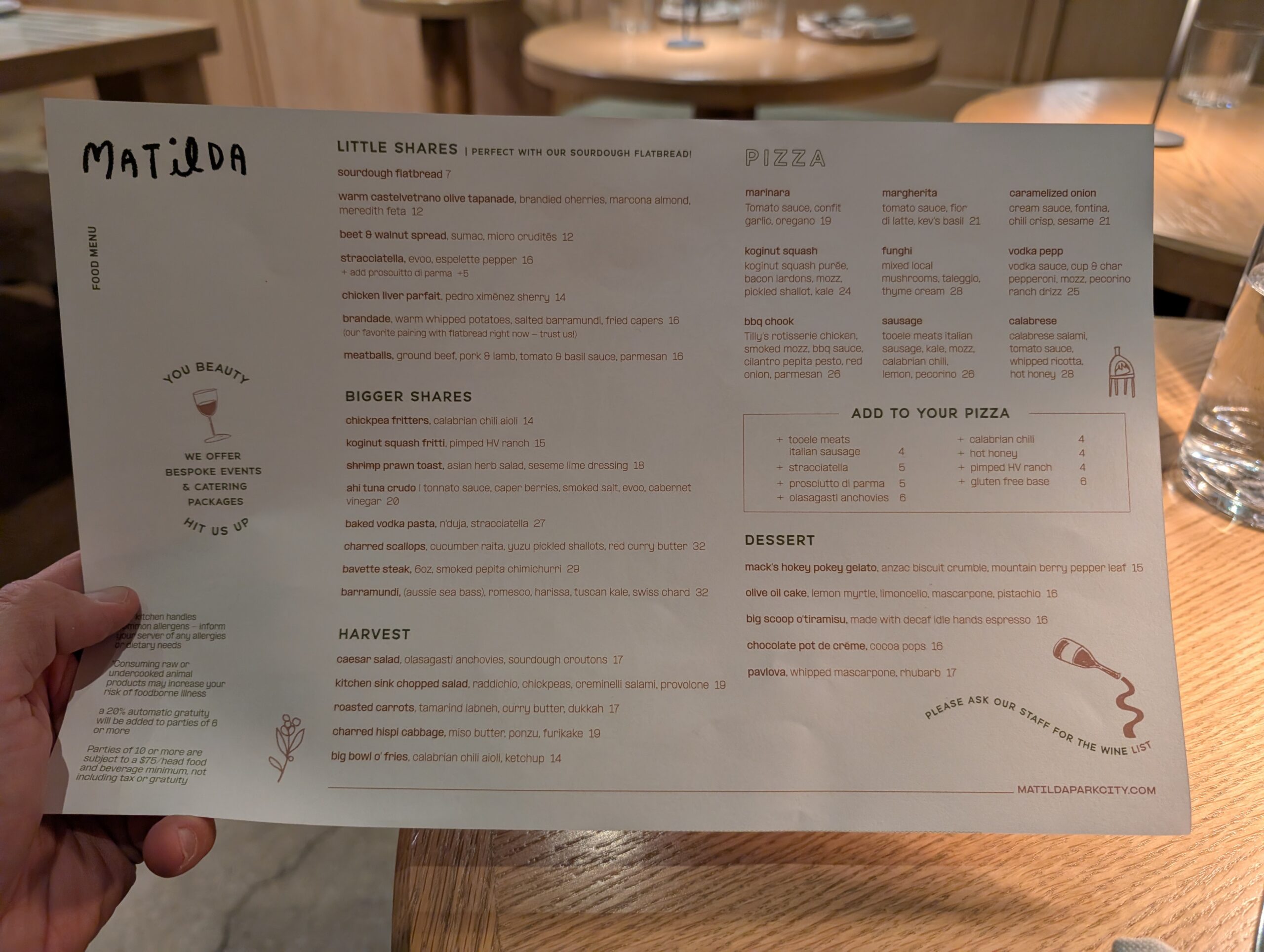 For dinner, we headed to Matilda for absolutely delicious appetizers and pizzas. We ordered the sourdough flatbread starter with meatballs, a Caesar salad, and a sausage pizza. Everything we tried tasted great. I would definitely recommend the restaurant to anyone in the area.