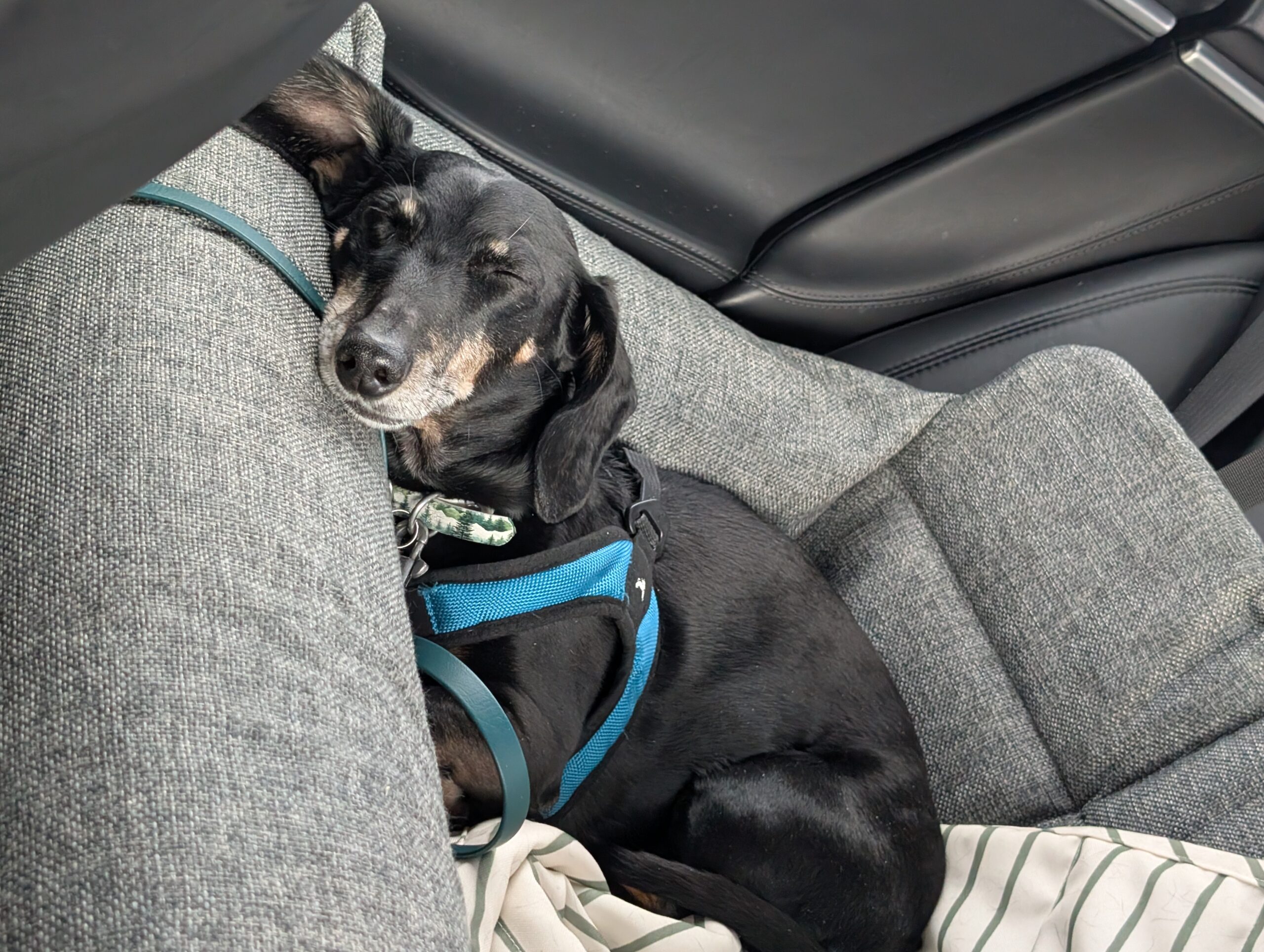 We started our road trip around 0830 and stopped to charge our car several times on the way to Deer Valley. As usual, Fitz enjoyed the drive and snuggled into his bed between stops.
