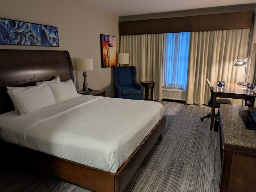 Check-in at the Hilton Garden Inn was pleasant with a friendly agent. The rooms are nice with a mini-fridge, microwave, and Keurig coffee maker. As with most airport hotels, you have to pay for parking even though there is a huge lot and it didn’t seem anywhere near full. The bed was comfortable enough with decent pillows and the location is quiet. If the hotel wasn’t labeled as such, you’d never know it was an airport hotel.