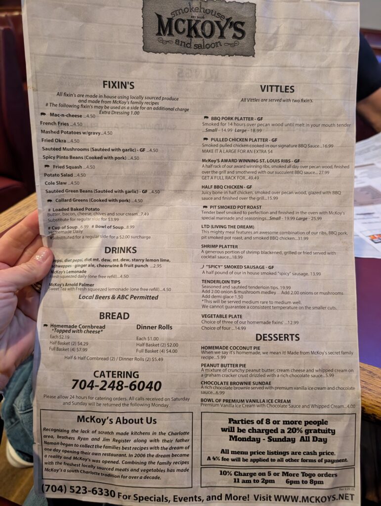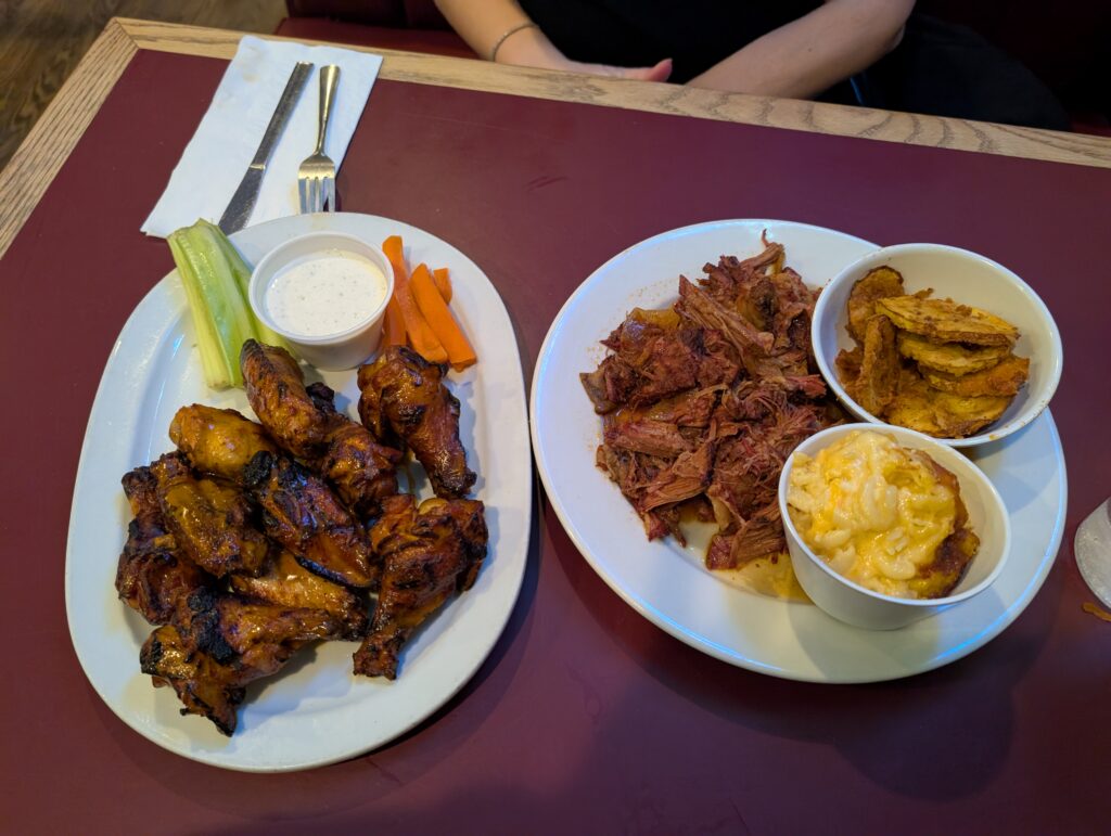 We took an Uber to dinner at McKoy’s Smokehouse and Saloon on the recommendation of the agent who checked us in. The food and service were both good and we enjoyed the grilled wings, pit smoked pot roast, mac and cheese, and fried squash. There were both vinegar and tomato based BBQ sauces on the table. I chose to stay authentic to North Carolina with the vinegar option; while tasty, I definitely prefer Austin-style BBQ.