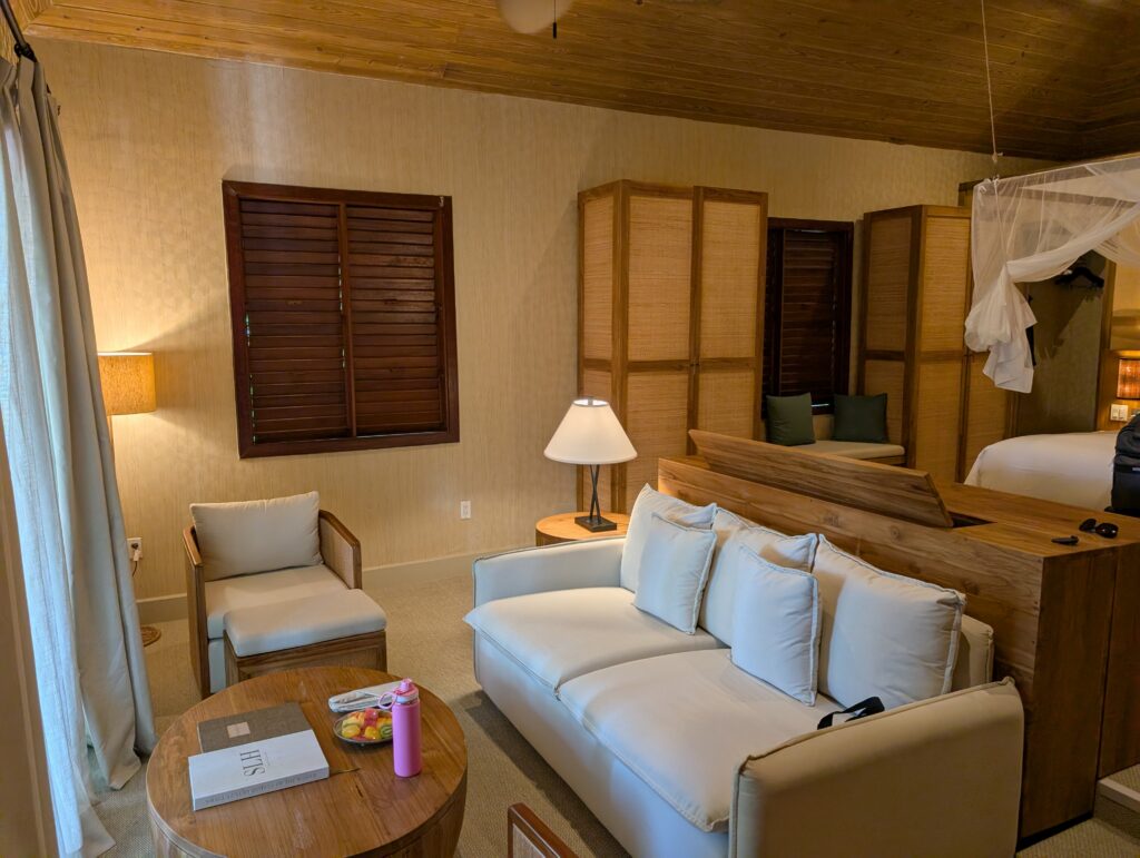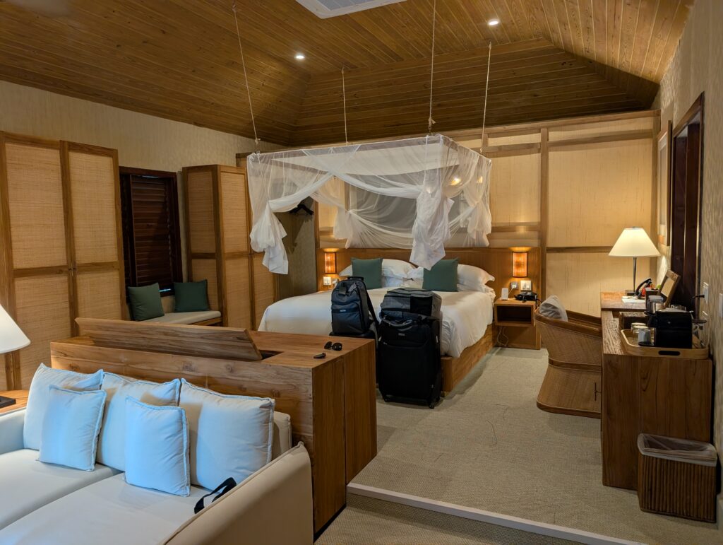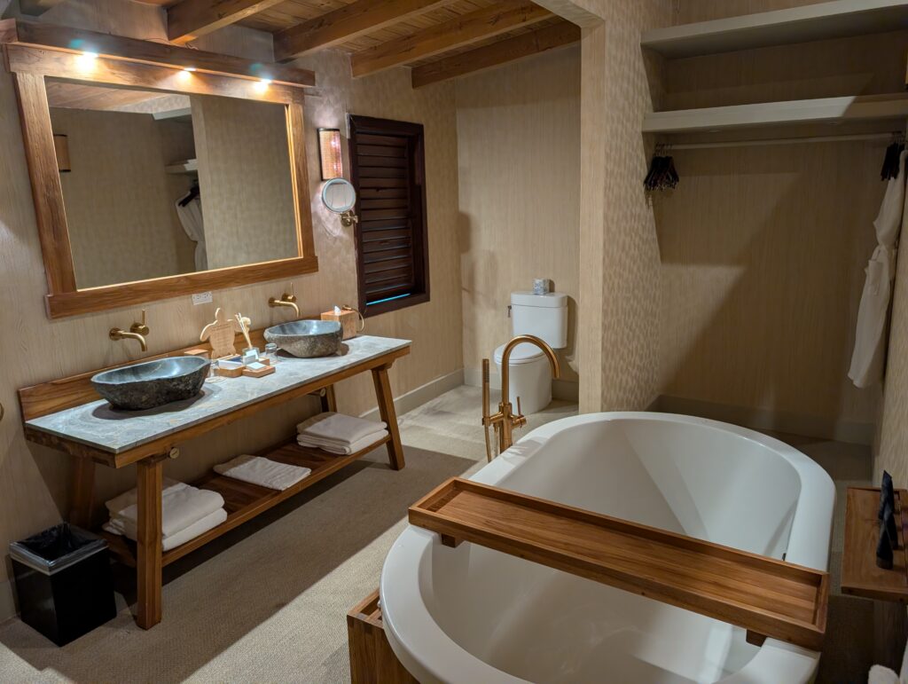 Our room was really nice and had an outdoor shower, which is a huge plus for me at a place like this. The balcony is not private and can be seen by other guests as they walk around the property. We couldn’t see the beach or the ocean given the foliage surrounding the room, but I could definitely hear it. In the room, the mini-bar is included. In fact, everything at the property is included except for some extra excursions that we weren’t interested in and top-shelf liquors.