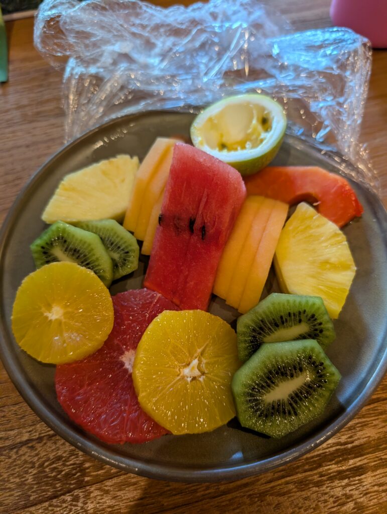 I slept in again and missed the organized yoga class. However, I was able to get a full session in by myself on our deck. Afterwards, we headed to breakfast. I ordered a protein smoothie of unknown ingredients, which was tasty, and we split a fruit plate. When the pastry basket came by, I tried the lemon poppy seed and banana breads.