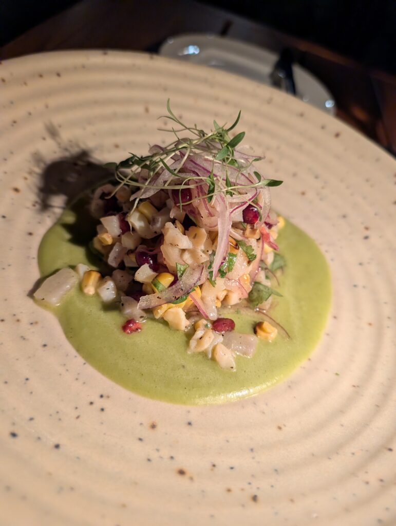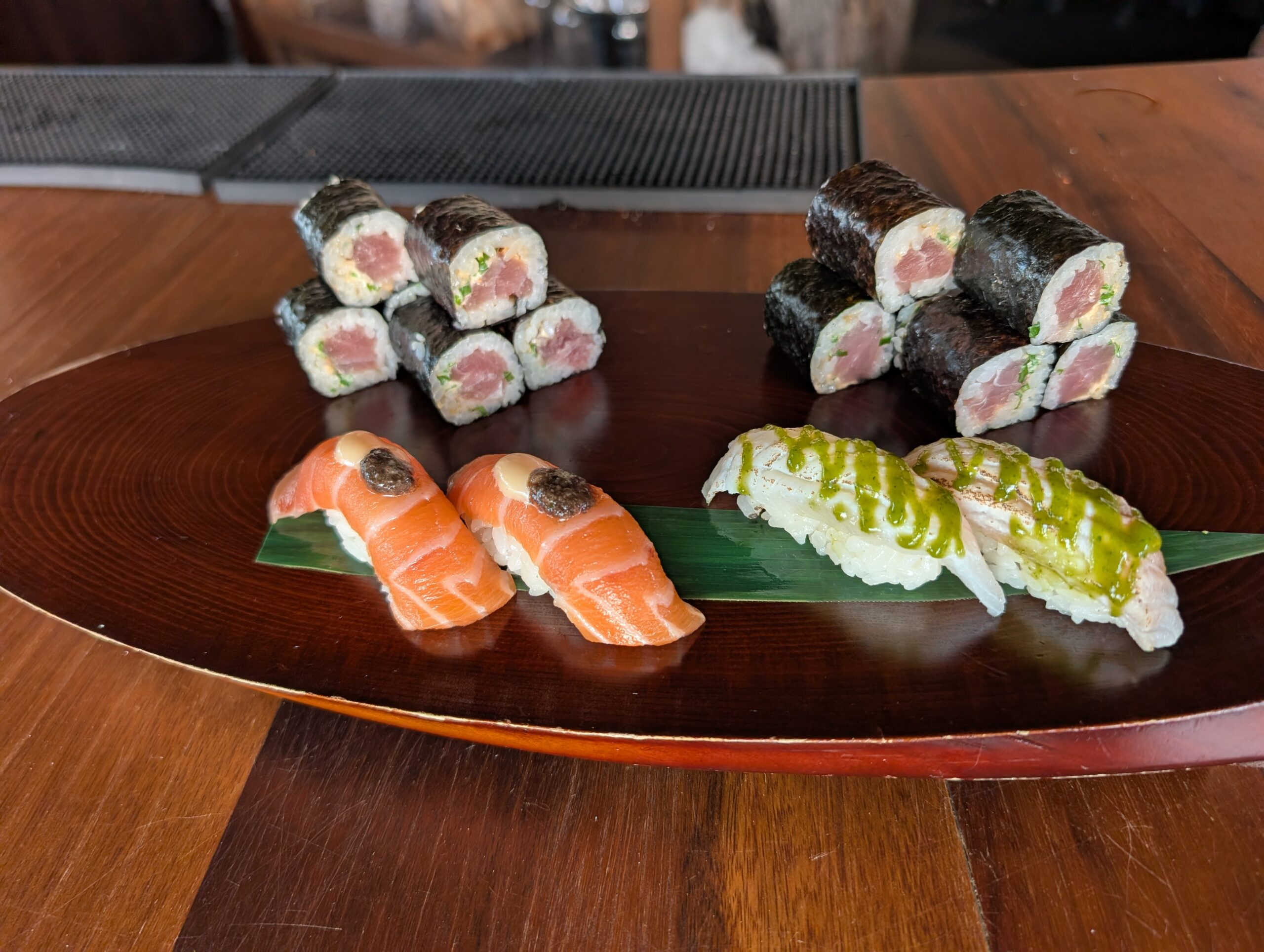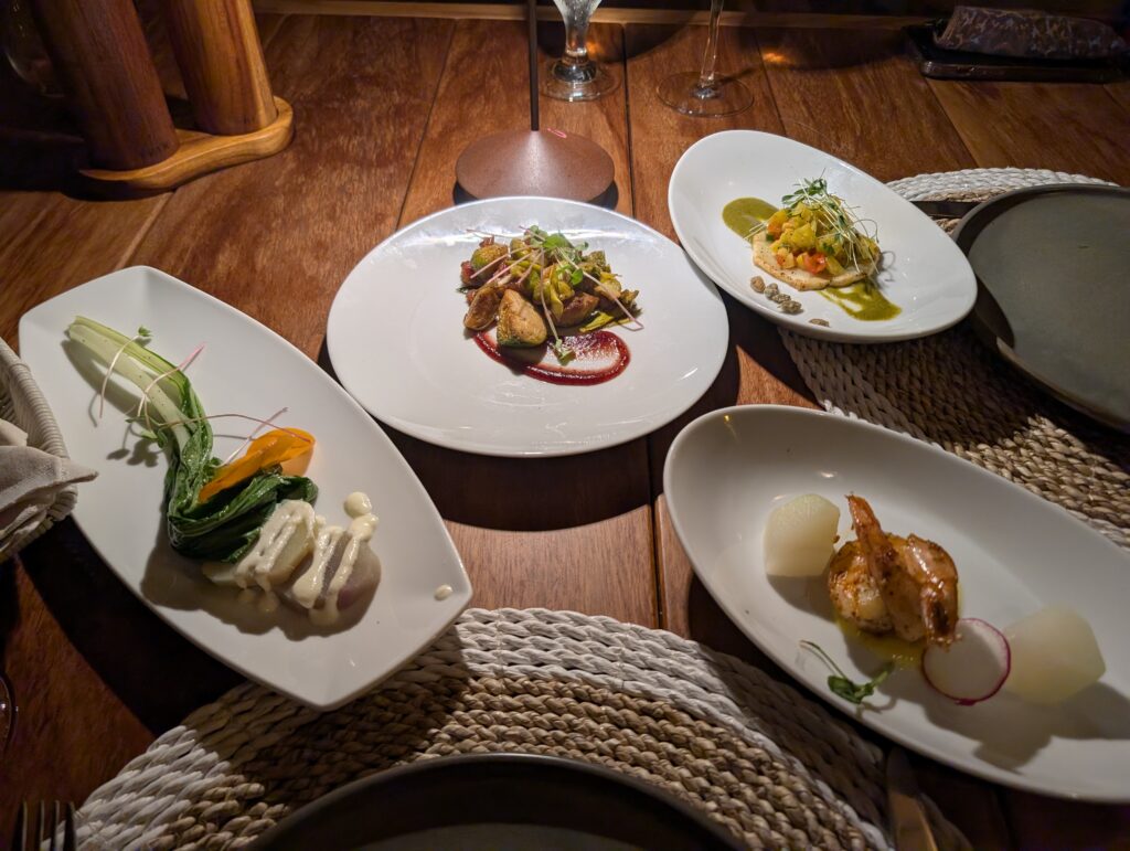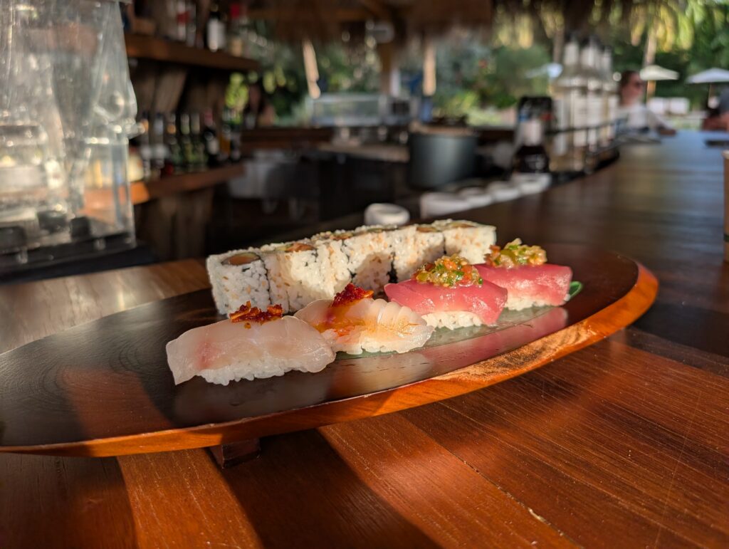 Our first stop at the resort was their sushi happy hour. It included a salmon avocado roll, two snapper nigiri with chili oil, and two tuna nigiri with a green salsa.