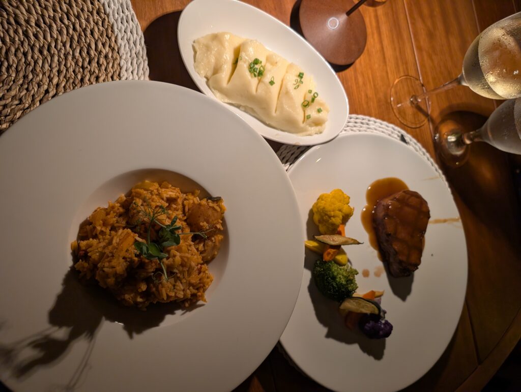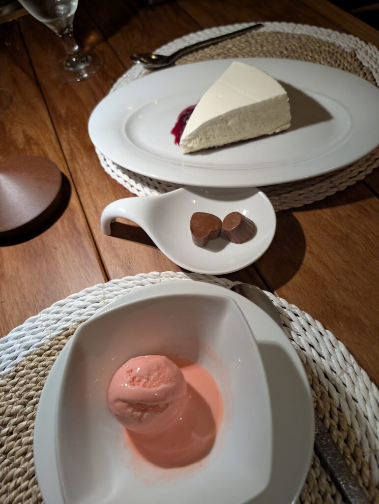 We returned to the room to relax before dinner. Like most nights, we headed to the bar for a drink before our evening meal. I tried the non-alcoholic passion fruit colada and it was pretty tasty. Dinner was organized differently this night. Every table was served the same four starters, and every person was given a choice of three entrees. Surprisingly, the starters didn’t match the menu description. We both chose surf-and-turf as our mains. It was tasty and served with a couple of unlisted sides, potato salad and vegetables. For dessert, I got a scoop of strawberry ice cream while my mother ordered the cheesecake.