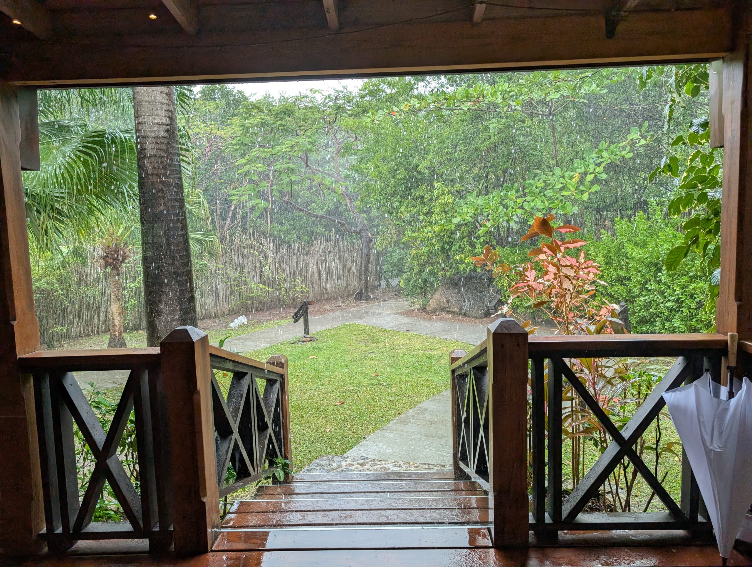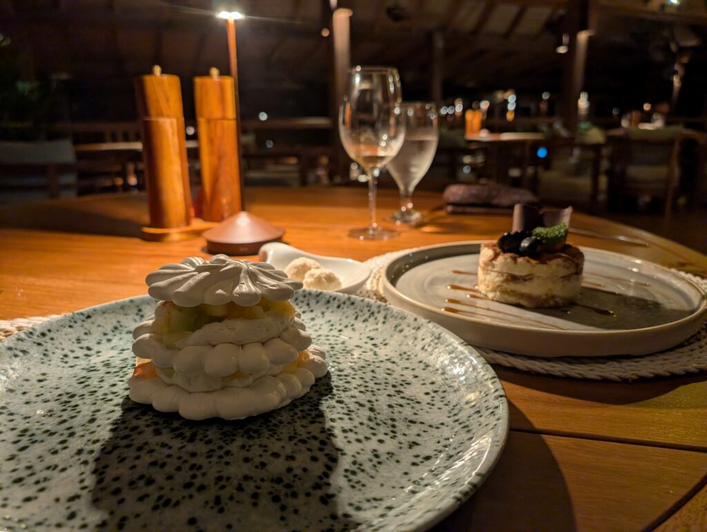 We returned to the room as it started to rain lightly. I listened to my book on the porch until it was time to eat. At dinner, I ordered seafood soup, blue marlin with quinoa rice and vegetables, and pavlova. My mother opted for conch ceviche, Chilean sea bass with mashed potatoes, and dark chocolate mousse. Everything was quite tasty.