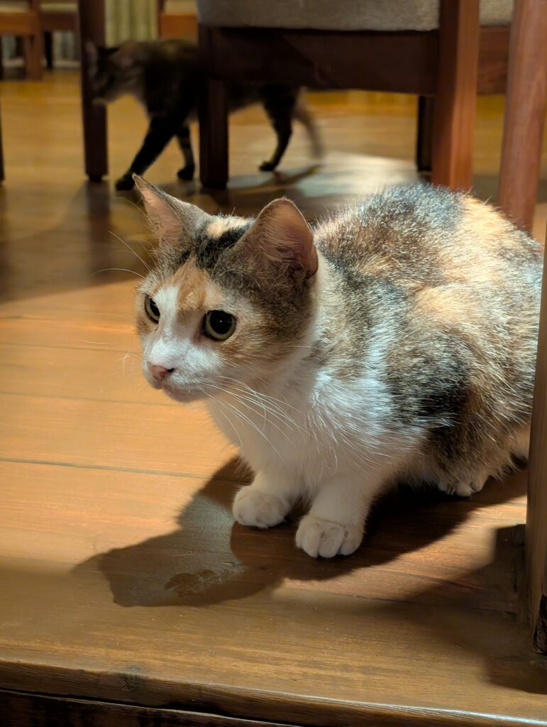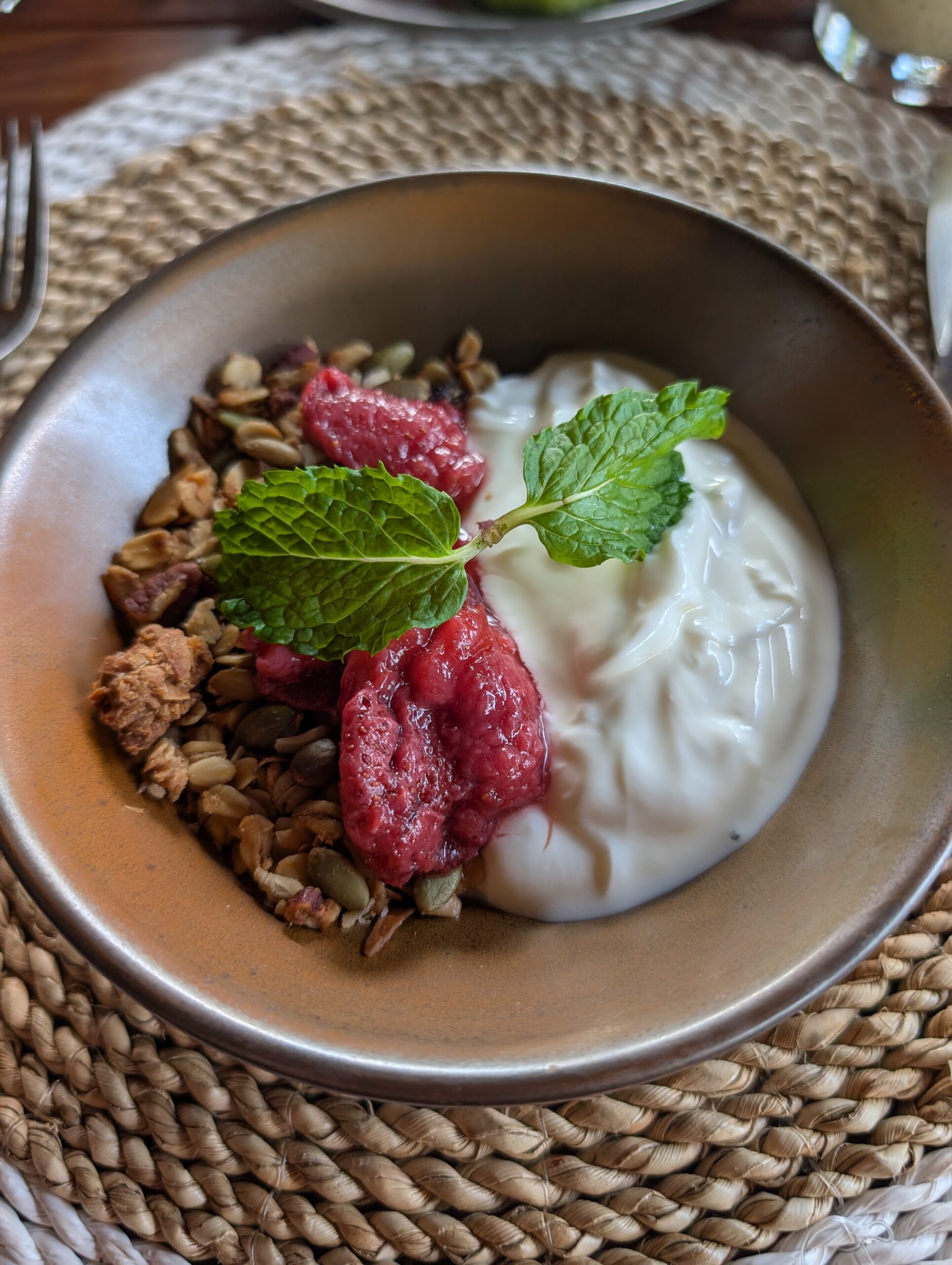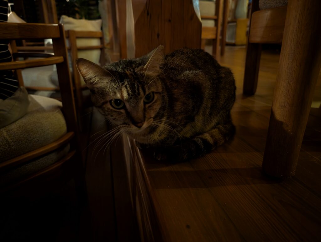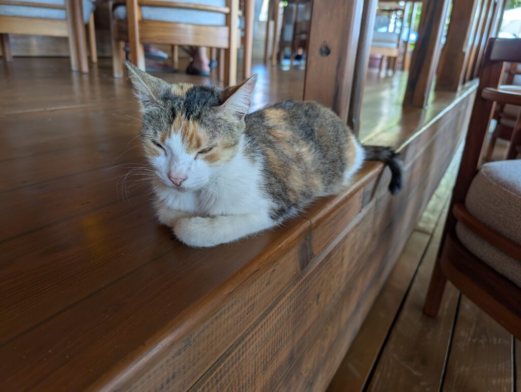 For breakfast, I opted for a protein smoothie alongside the granola and yogurt dish. We were joined at our early breakfast by a very sleepy cat.
