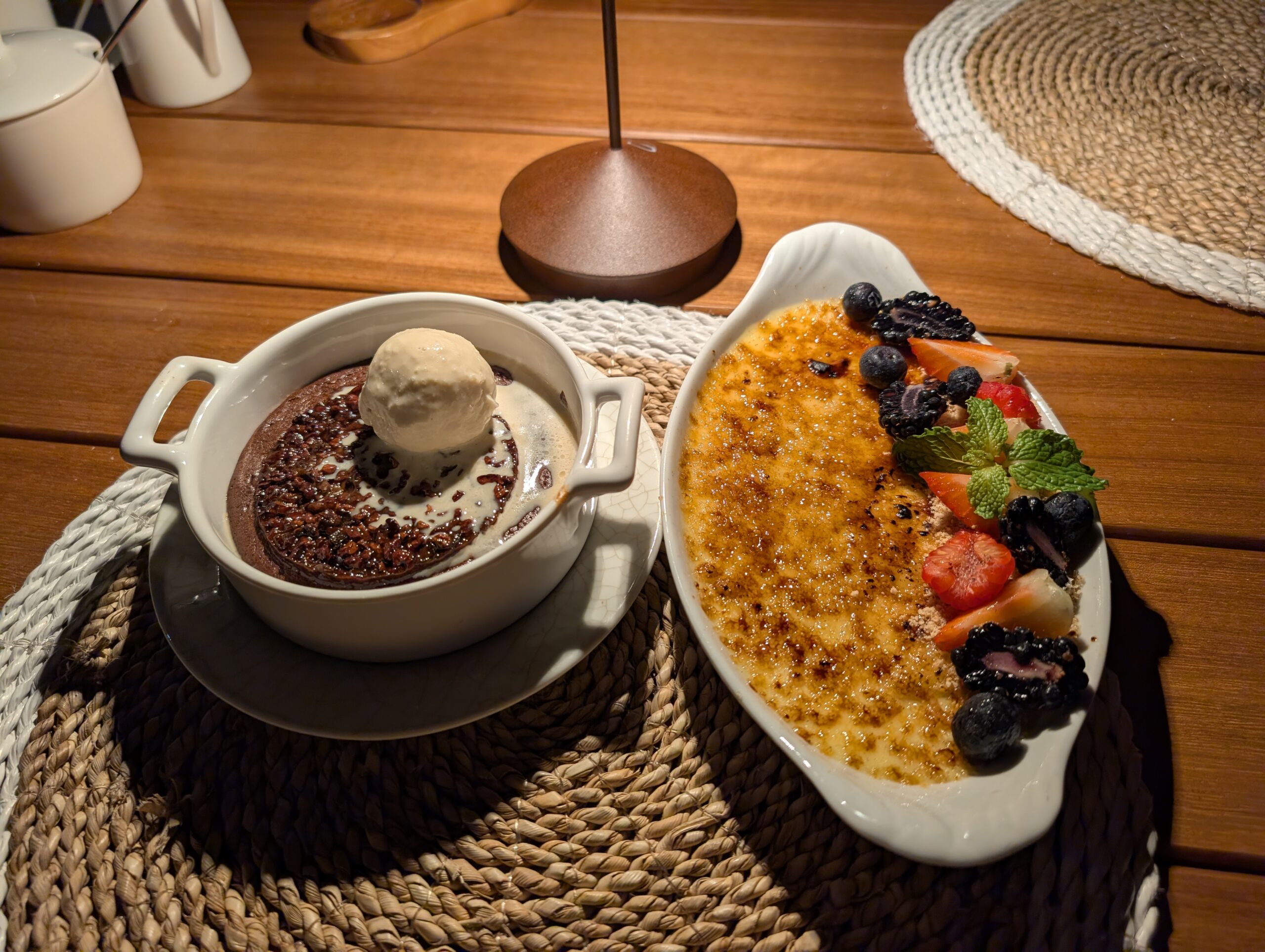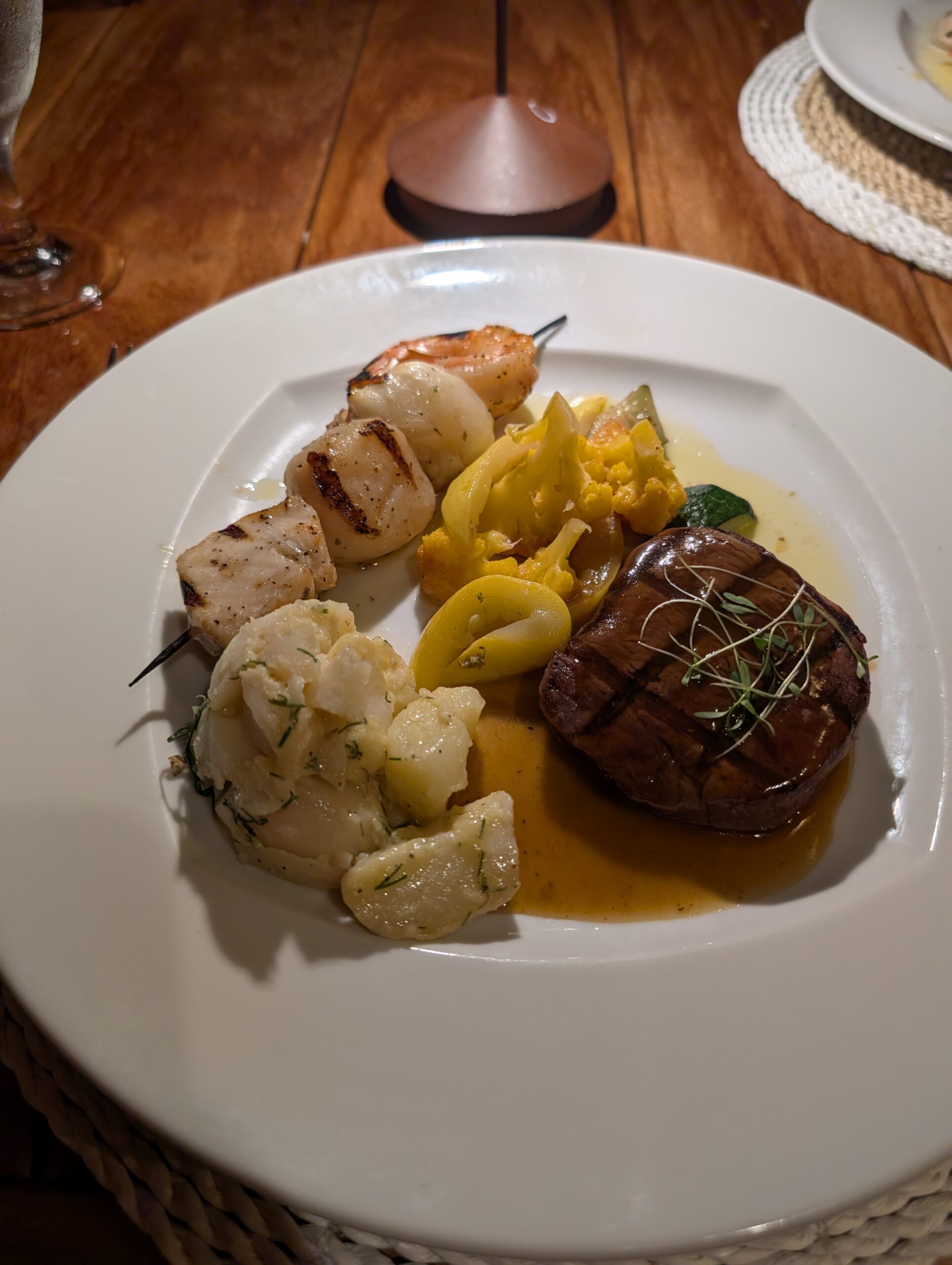 My mother ordered the mahi and shrimp fritters again. For her entree, she chose the scallops with mashed potatoes. The scallops featured a green curry sauce which was quite heavy on the coconut. For dessert, she enjoyed creme brulee.