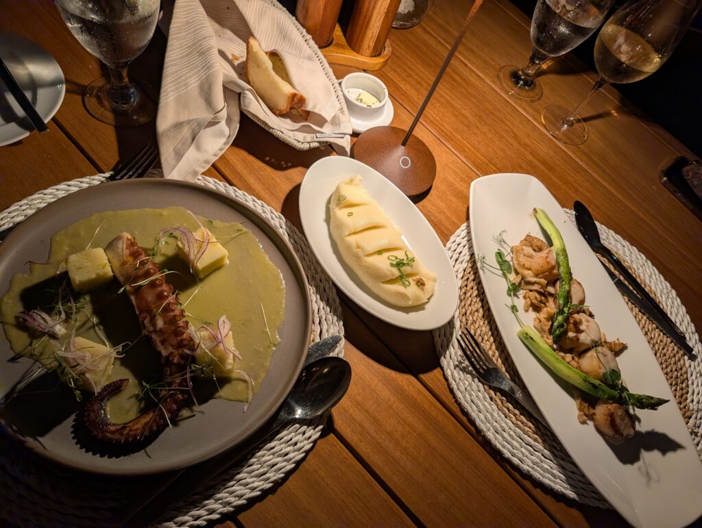 This was probably my favorite dinner of the trip. I had conch ceviche, grilled octopus, and chocolate mousse for dessert (only after being told that they ran out of apple tarts). The conch ceviche was bright and acidic from citrus and pomegranate with some sweetness provided by grilled corn. It was very nicely balanced. The grilled octopus was cooked nicely and came served with a citrus sauce. The chocolate mousse ended up being chocolate lava cake, which was tasty.