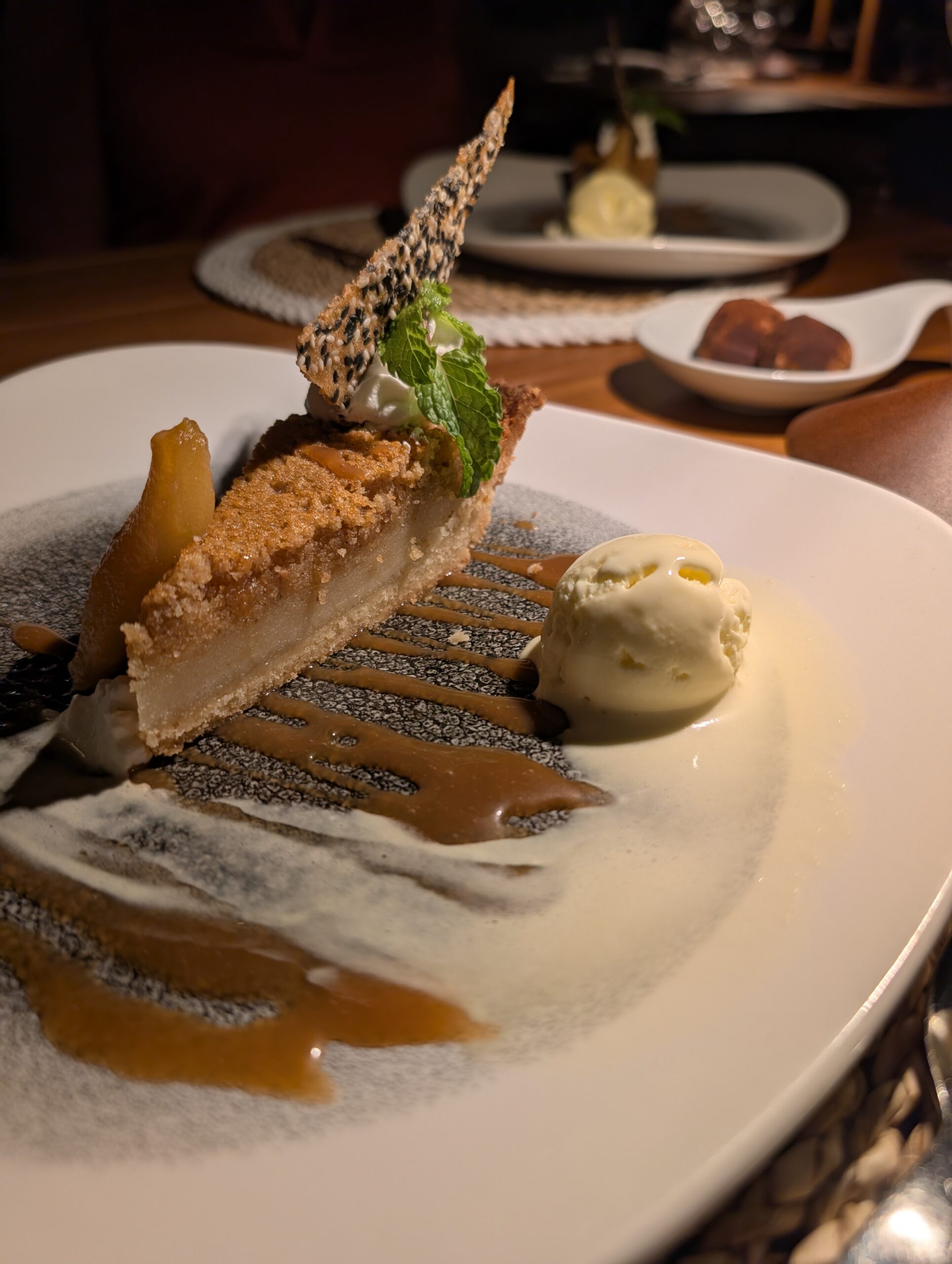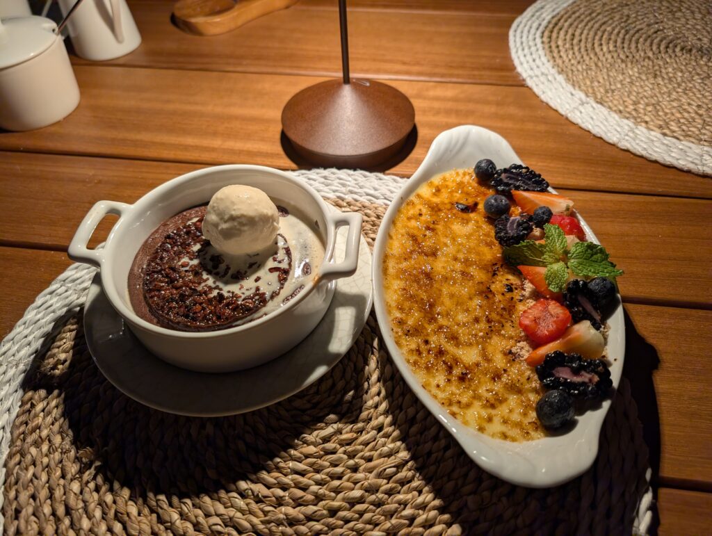 For dinner, we both ordered the conch ceviche to start and chose the nightly special, a rib-eye with blue cheese potato mash, yellow squash, and rosemary jus, for our entree. For dessert, we chose the hazelnut brown butter pie, another nightly special. While the food was probably the best we had during our stay, the service was the worst we’d had since starting our visit. This was likely because of a large party with a dozen people.