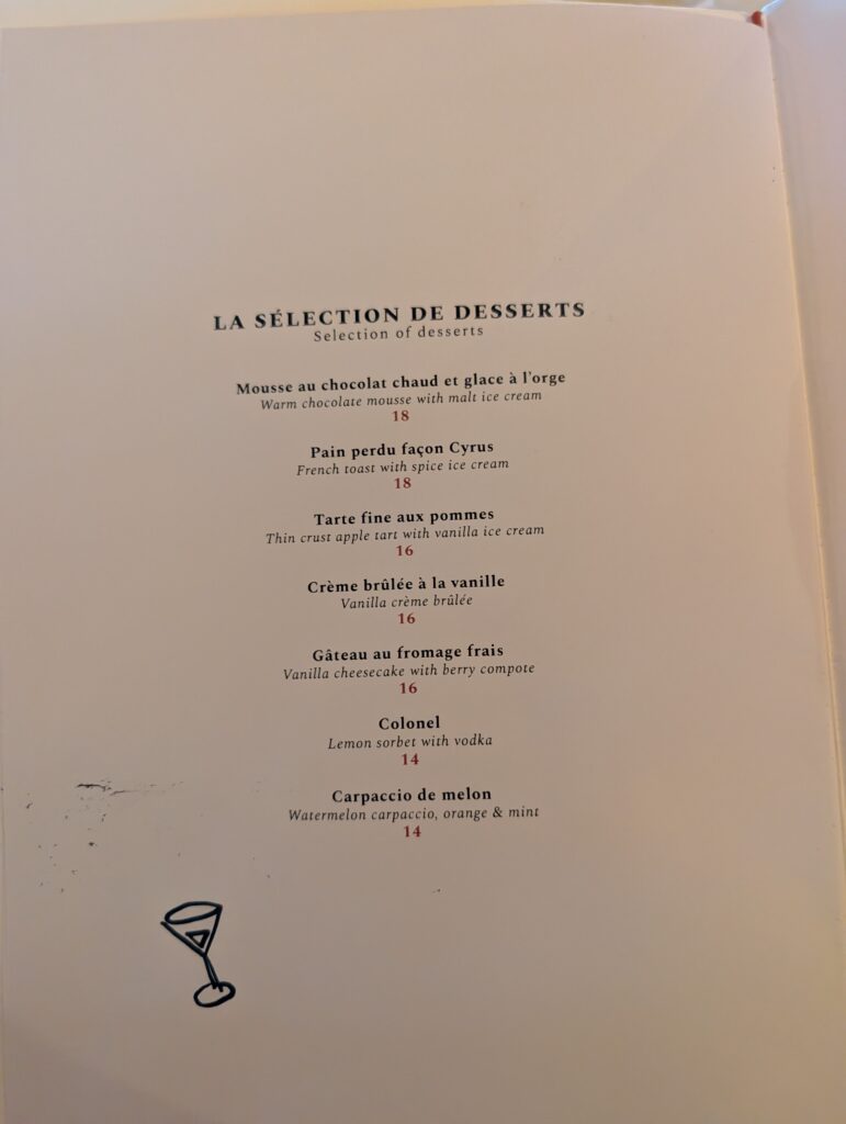 I also asked for whatever the welcome drink was. It isn’t on the menu, so I don’t know what was in it, but I think it was non-alcoholic sparkling wine, mint, and passion fruit syrup.